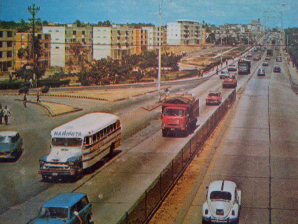 Santo Domingo en la decada del 70. Se destaca el carro Volkswagen, la guagua del transporte de la linea Marinita. Al fondo edificios multifamiliares construidos en los gobiernos de Balaguer.